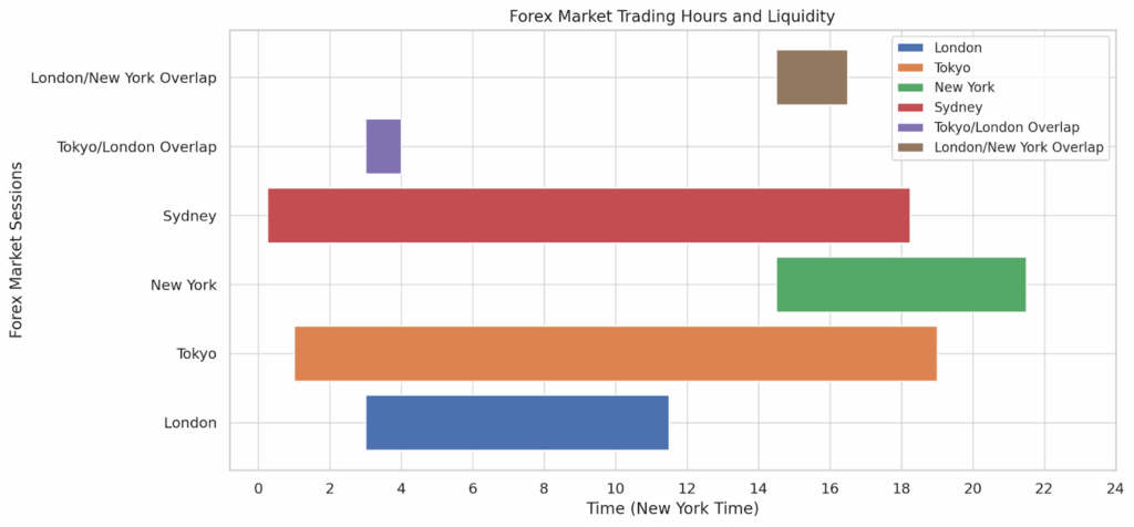 The chart below outlines the active hours for each major forex session in New York time (UTC-5), including two critical overlaps:
