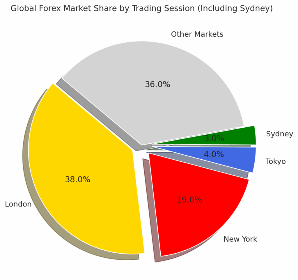 This chart highlights the proportion of total forex trading volume handled by each session. London dominates global trading with 38 per cent, followed by New York at 19 per cent. Sydney and Tokyo, while smaller, still play important roles in market continuity and offer unique trading opportunities.