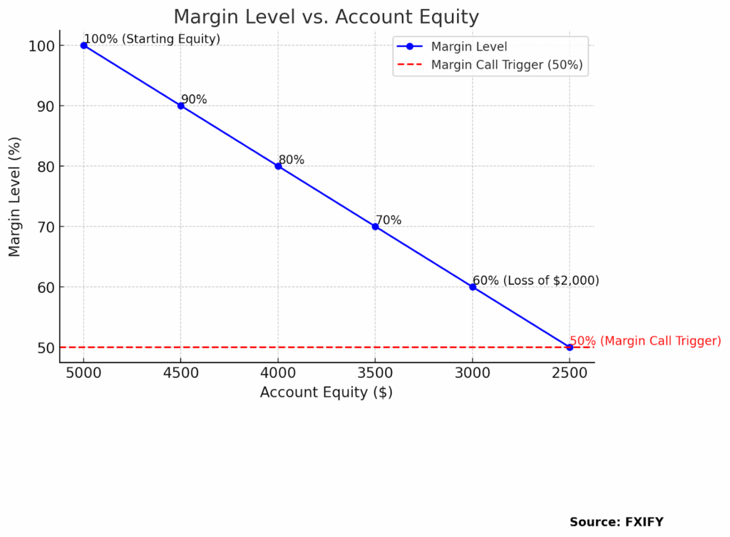 - If your equity drops to $3,000, your margin level falls to 60%—getting close to the danger zone.