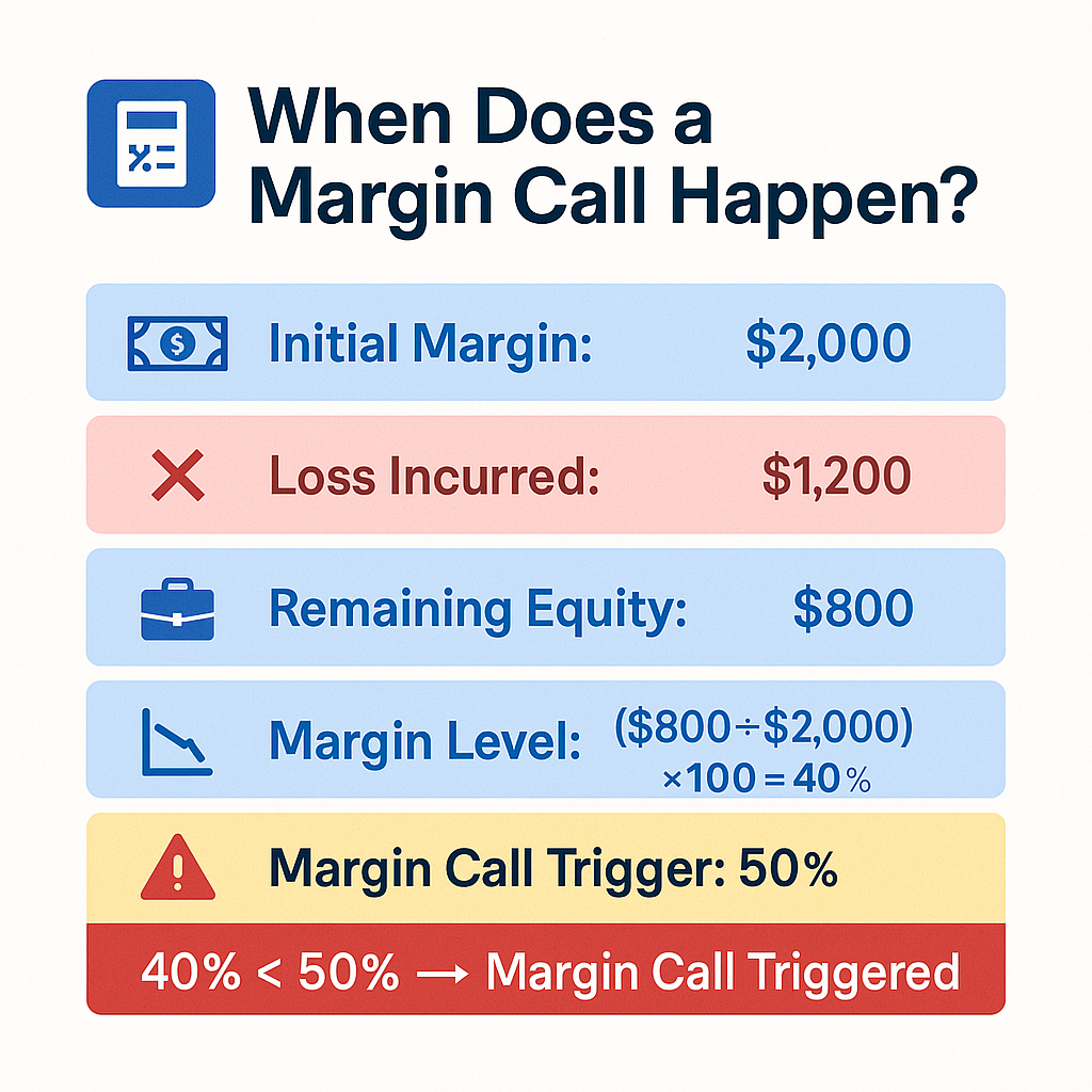 Here’s how a margin call gets triggered when losses reduce account equity below the broker’s required margin level: