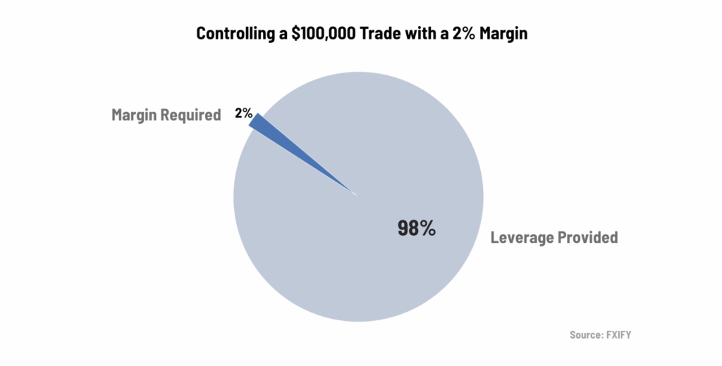 This chart shows how a 2% margin means only $2,000 is required to control a $100,000 trade–the rest is leveraged.