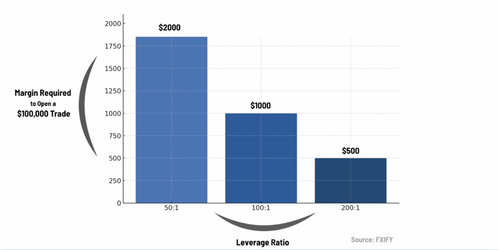 - With 50:1 leverage, a trader needs $2,000 in margin to control a $100,000 position.