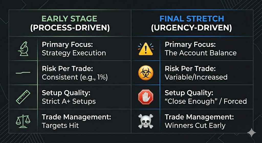 - The final stretch of a trading evaluation is a psychological trap. Proximity to a reward triggers urgency, and urgency leads to rule-breaking.
