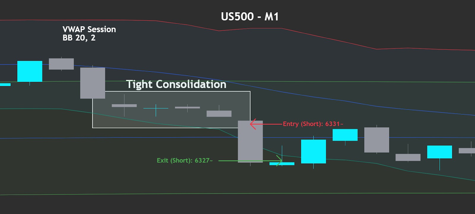 Price built a short M1 support shelf near $6,331 while VWAP trended above and below. The 16:45 candle broke and closed below the shelf, staying below the VWAP, and opened a room toward $6,326–$6,327, which aligned with the first lower Bollinger Band tag.