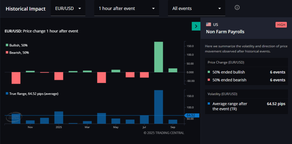 According to the Trading Central Economic Calendar (available in your FXIFY dashboard), the average one-hour move in EUR/USD following recent NFP releases is 64.5, with volatility often high on both sides of the release.