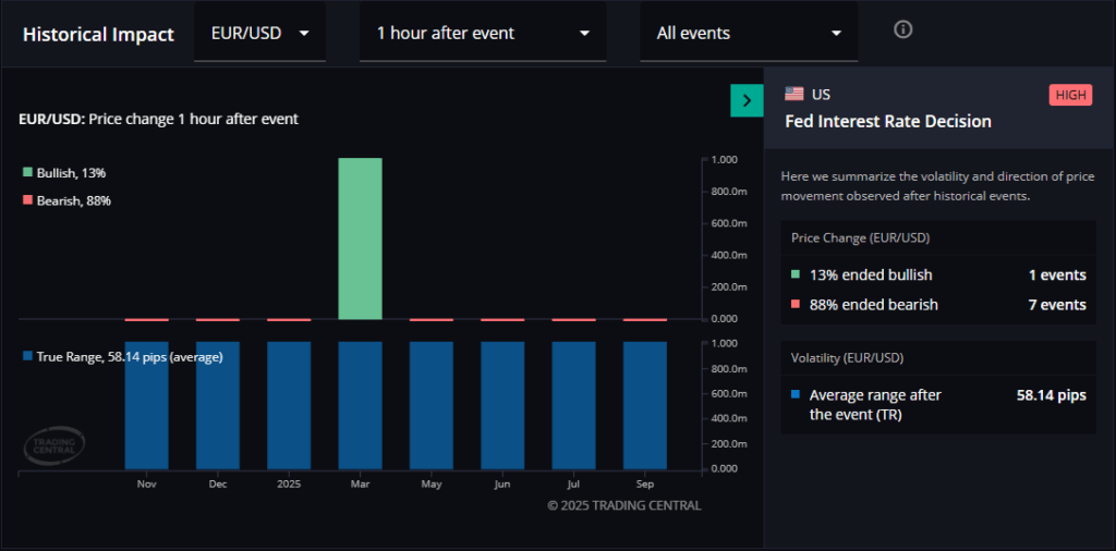 Trading Central data shows that EUR/USD has moved an average of 58.14 pips one hour after the FOMC rate decision.