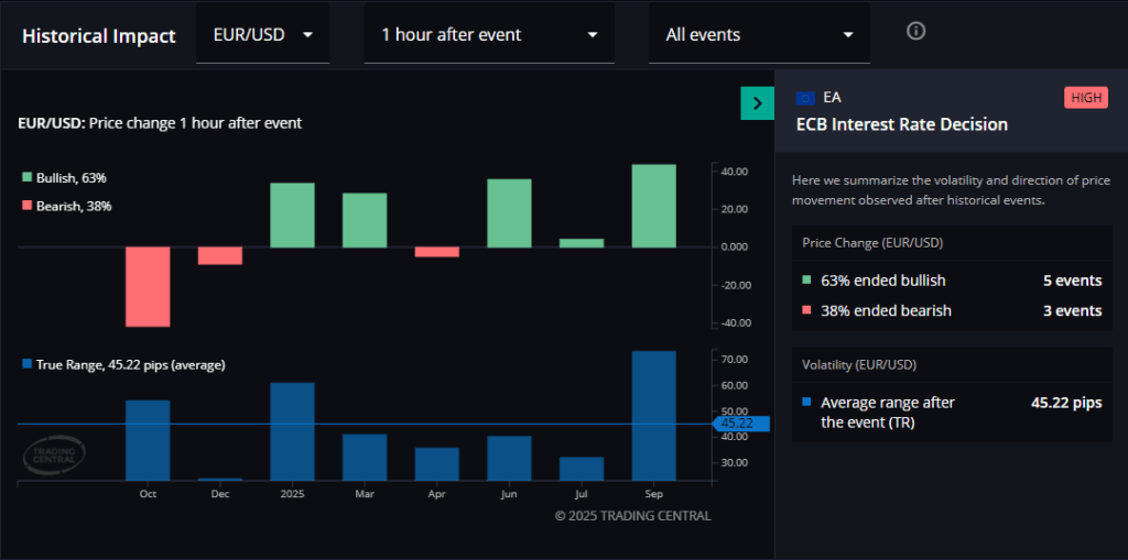 According to Trading Central data, the average one-hour move in EUR/USD following recent ECB press conferences is 45.2 pips.
