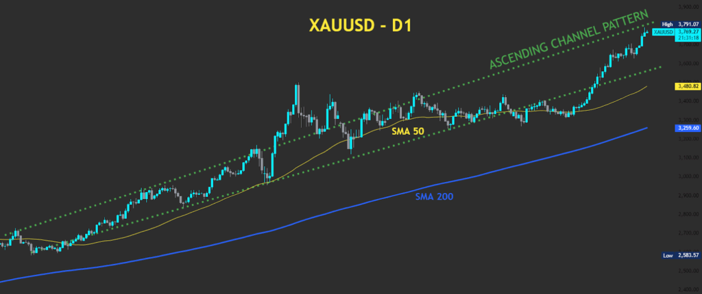 The price action is defined by an ascending channel pattern, with higher highs and higher lows. Gold remains well above its 50-day and 200-day moving averages, confirming the long-term uptrend. Key support is the lower boundary of the channel, currently trending in the $3,550-$3,600 area. As long as this channel holds, the trend favors a continuation toward and beyond the recent high of $3,791.”
