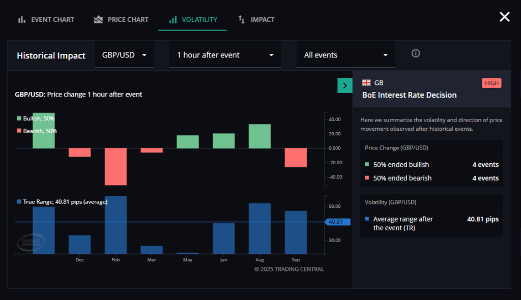 According to the Trading Central Economic Calendar (available in your FXIFY dashboard), recent BoE days showed an average one-hour range of ~40.81 pips on GBP/USD, with 50% of outcomes bullish and 50% bearish.