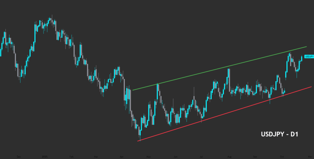 Into US Core CPI (13 Nov) and Core PCE (26 Nov), the map is straightforward. A daily close above 153 would keep momentum pointed toward the 155.00 area and the channel top. A clear rejection at the guide followed by a close back under 150 would warn of a deeper move toward the rising base near 148.0–148.5.