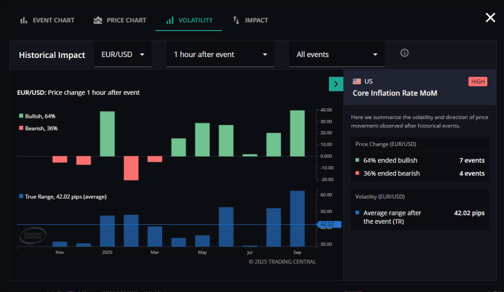 According to Trading Central (FXIFY dashboard), EUR/USD has averaged ~42.02 pips of one-hour range on recent Core CPI releases, with ~64% of outcomes finishing bullish EUR/USD (USD weaker).