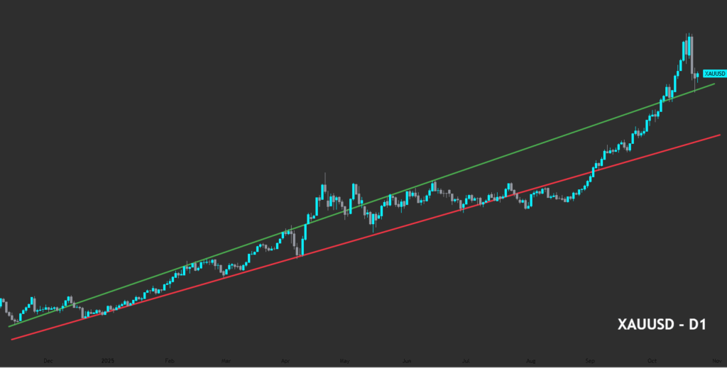 The daily chart shows an ascending channel defined by a rising base trendline (red) and a higher guide line (green). After a sharp rally to fresh highs, price has pulled back to the green guide, which now acts as first support. Holding this line keeps the bias pointed back toward the upper channel; a decisive daily close below the green guide would open room toward the red base where buyers may regroup into the mid- and late-month data releases.