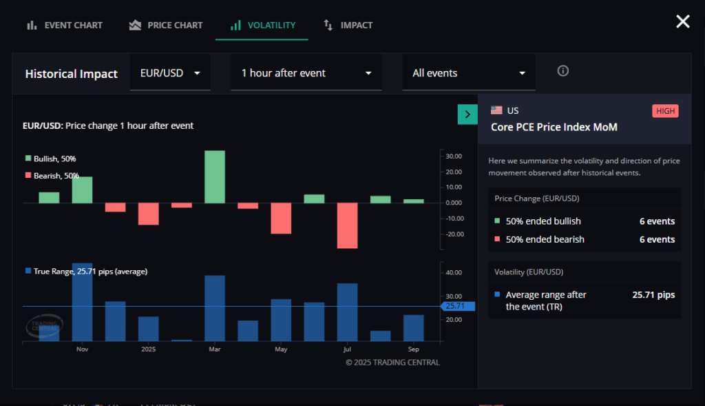 Trading Central data shows EUR/USD averages ~25.71 pips of one-hour range around Core PCE—quieter than CPI but still meaningful for front-end yields and USD pairs.