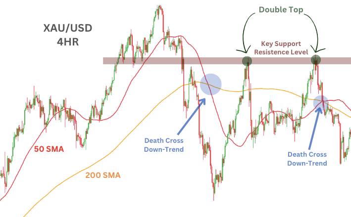 This chart highlights two bearish Death Cross patterns, reinforced by a key support zone and a distinct double top formation. When these technical signals are properly identified and utilised, they can offer excellent swing trading opportunities.