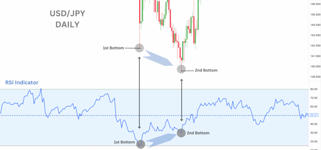 In the chart below, USD/JPY forms a double bottom—a bullish price pattern—while the RSI makes a higher low the second time. This mismatch is called bullish divergence and often means the downward pressure is weakening.