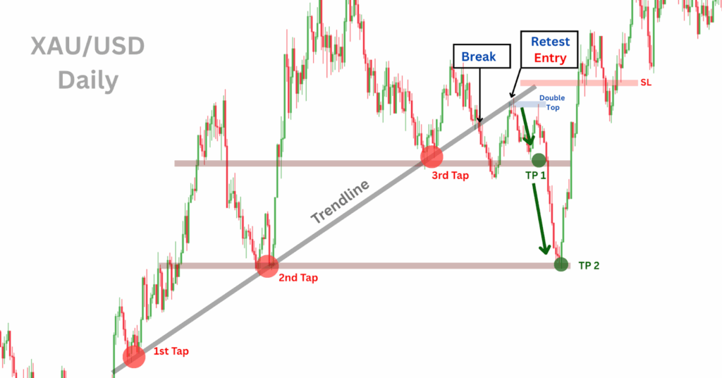 This daily XAU/USD (Gold) chart shows a classic breakout setup using a rising trendline. The price taps the trendline three times, each touch weakening the level.