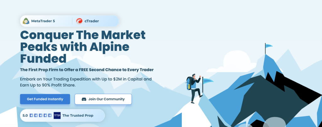 Alpine Funded is among the prop firms with no consistency rule across programs, whether you choose Base Camp instant funding or the Peak 2-step evaluation. Any percentage of your total profit does not cap your best trading day, and this applies across funded stages too. Alpine operates on cTrader with profit splits up to 90%.