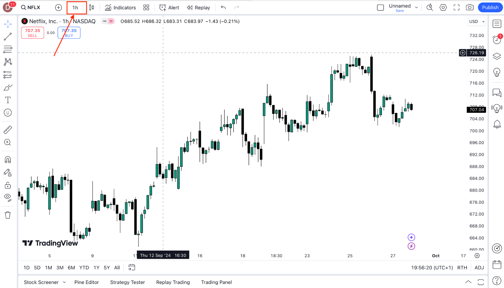 3. You can also quickly switch timeframes using the keyboard shortcuts (e.g., 1 for 1-minute, 1H, for 1 hour, 1D for daily).