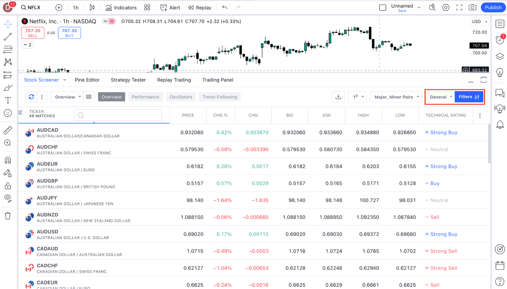 The Screener helps you quickly narrow down a large list of assets to those that fit your trading plan.