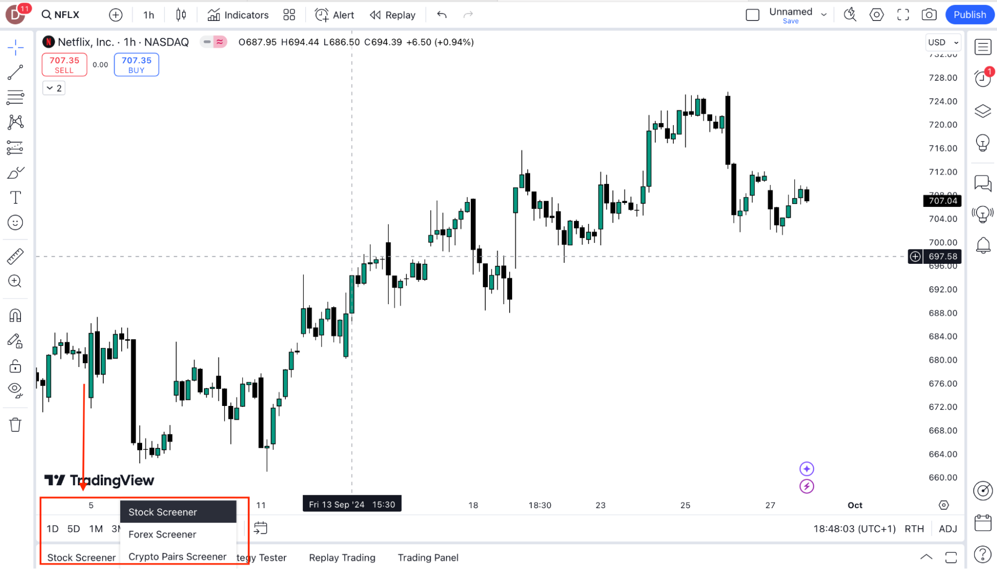1. Click the Screener tab at the bottom of the TradingView interface.